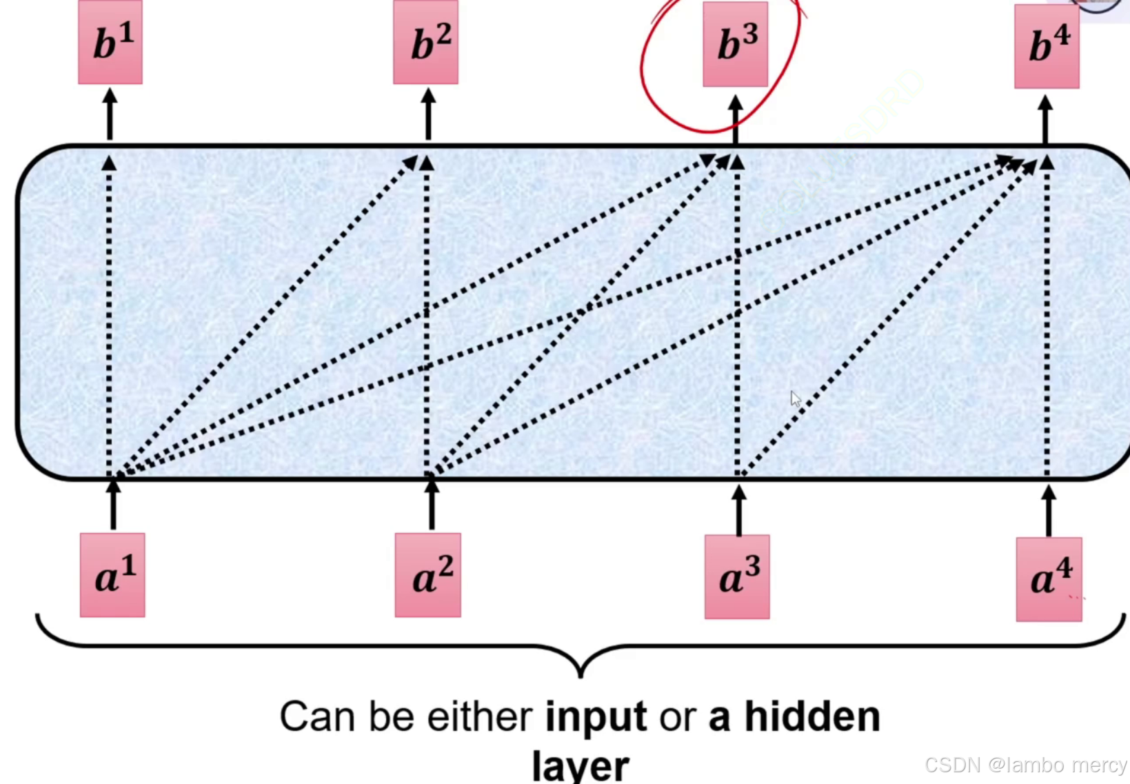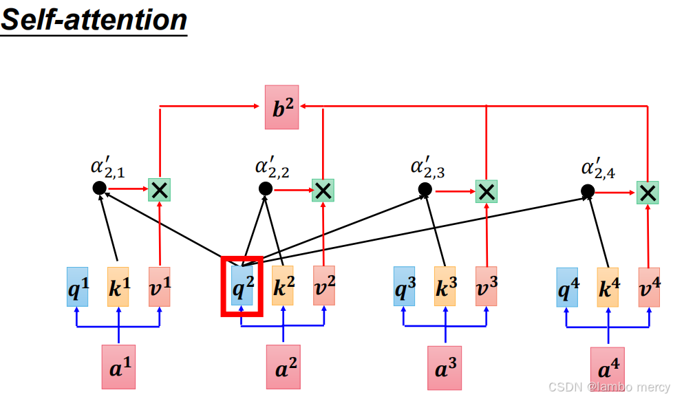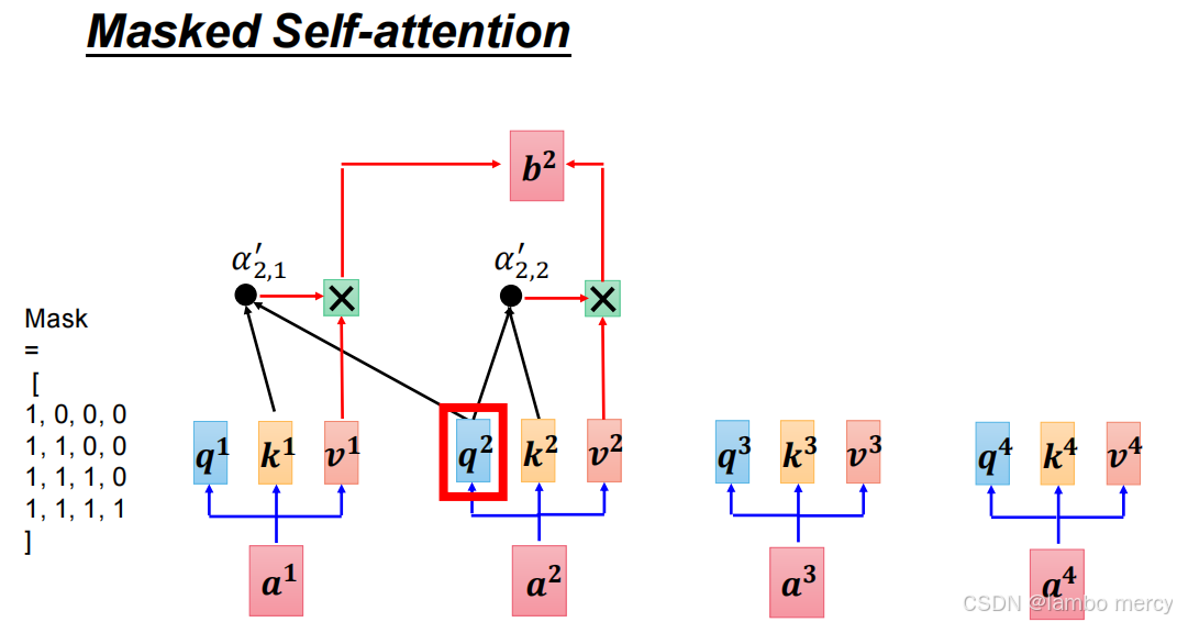 b²时,通过掩码矩阵 限制了注意力范围:图左侧的掩码矩阵(第二行是[1,1,0,0])规定:第 2 个位置仅能关注前 2 个位置(a¹、a²) ,无法关注后续位置(a³、a⁴)。反映在图中:q²仅与k¹、k²计算有效注意力权重(α'₂,₁、α'₂,₂),k³、k⁴对应的权重被屏蔽(图中无连接),最终b²仅是v¹、v²的加权组合。