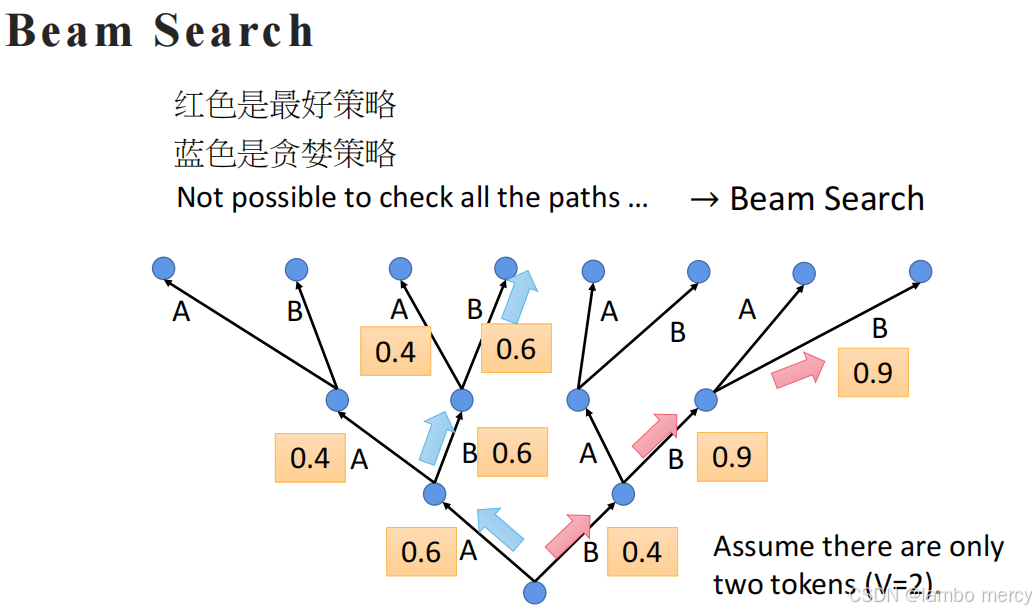 - 全路径搜索 :遍历所有可能的 token 组合(图中 "所有 paths"),能找到总概率最高的 "最好策略"(图中红色路径),但当词汇表或序列长度较大时,路径数量呈指数增长,计算量完全不可行(即图中 "Not possible to check all the paths")。