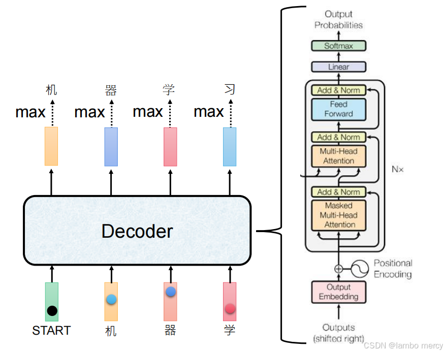 - 步骤 1:以特殊 token "START" 为初始输入,通过 "max" 操作从输出概率分布中选取 "机";