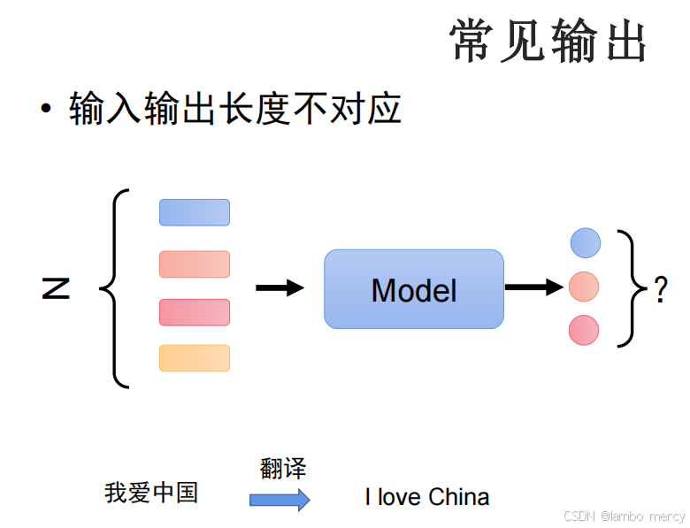 - 可能与输入长度不一致(比如翻译任务中,英文输入长度≠中文输出长度);