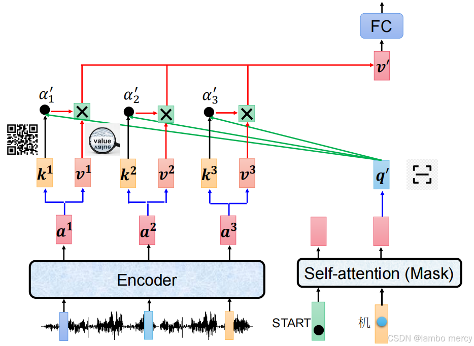START为起点,先经过Masked Self-attention ,得到当前生成步骤的查询(Query,q)------ 这是 Decoder "当前生成状态" 的特征表示。