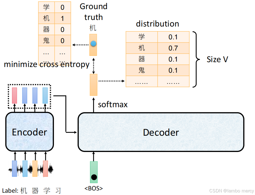 - Encoder 输入:接收 "机器学习" 对应的语音信号序列,编码为特征表示后传递给 Decoder;