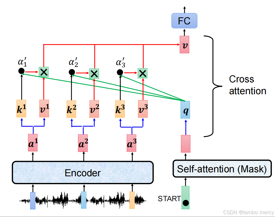 q,分别与 Encoder 的k¹、k²、k³计算注意力得分(图中α'₁、α'₂、α'₃),得分越高代表q与对应k的语义关联越强; - 得分归一化(隐含步骤):对得分做 Softmax 处理,得到总和为 1 的注意力权重;