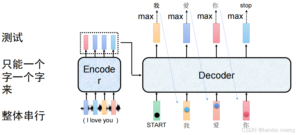 - 流程:测试时无真实标签,只能以 "模型自己生成的前一个 token" 作为下一个 token 的输入(如从