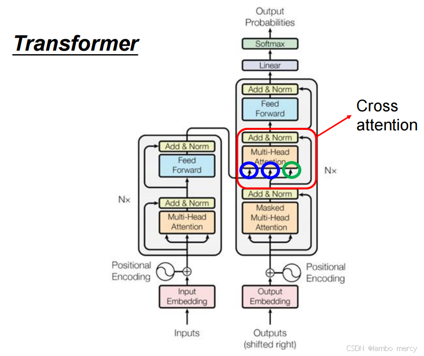 Feed Forward(前馈网络)之前; - 每一层 Decoder 都会包含这一模块(图中 "N×" 代表多层堆叠)。