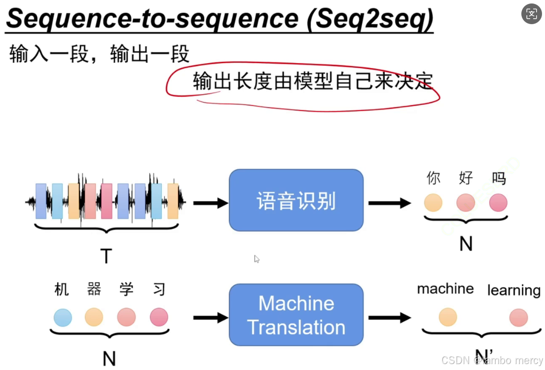 - 语音识别:输入为长度为 T 的语音信号序列,模型自主生成长度为 N 的文本序列(如输入语音信号,输出 "你好吗"),T 与 N 长度不固定。