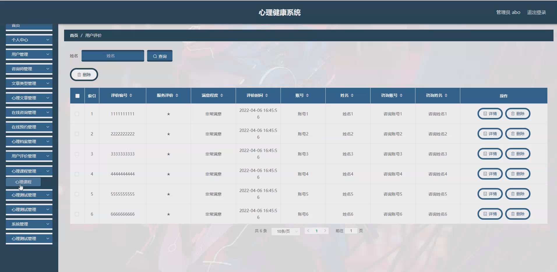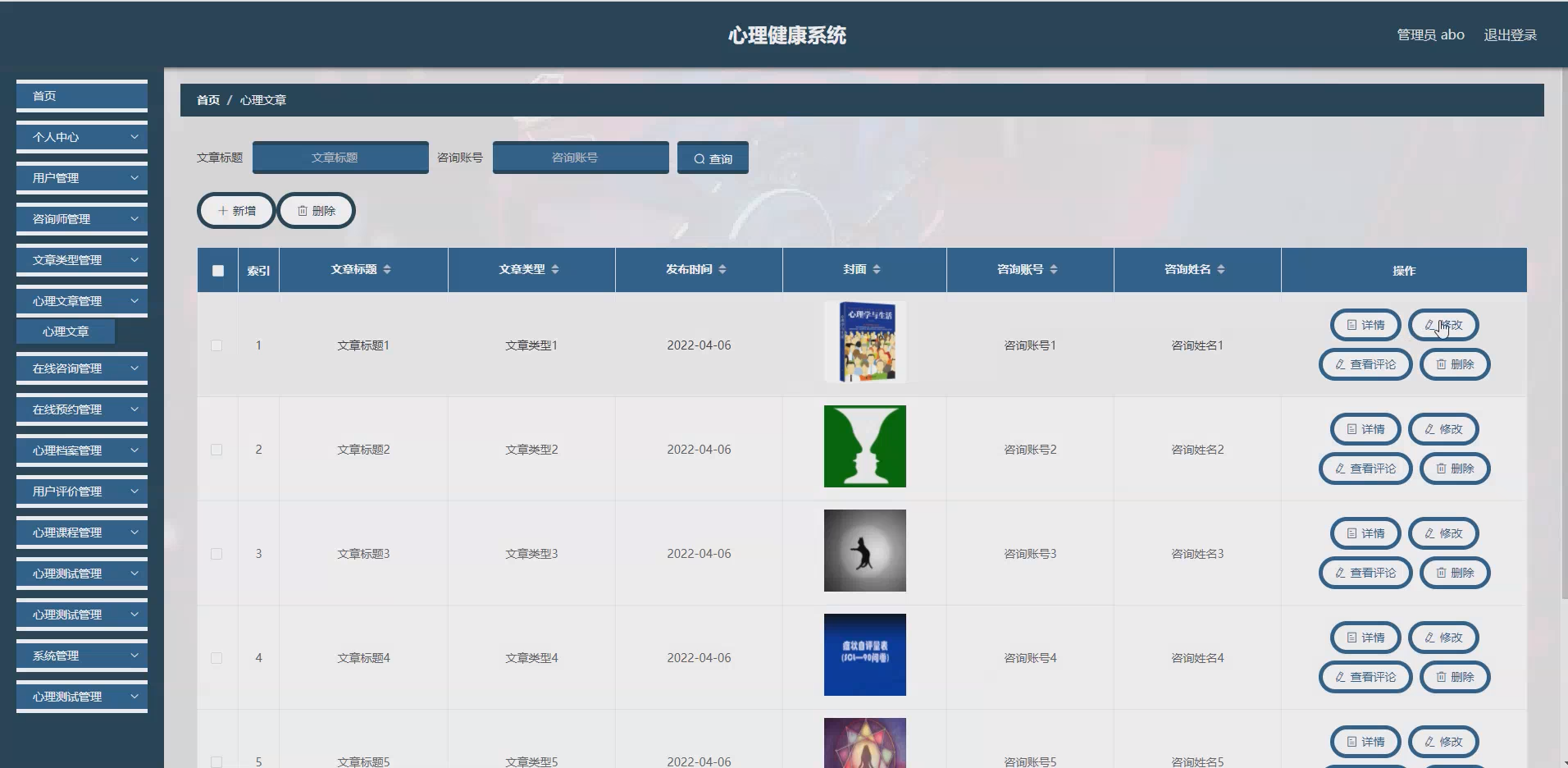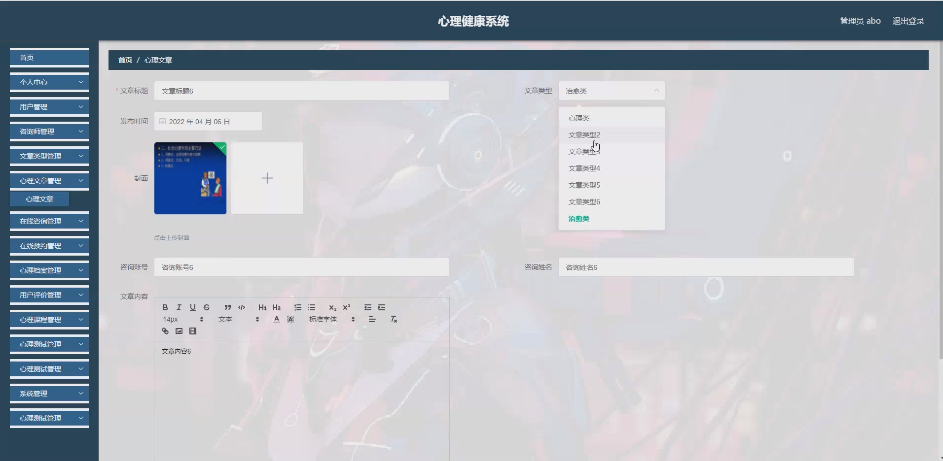 系统项目功能:用户,咨询师,文章类型,心理文章,在线咨询,在线预约,心理档案,用户评价,心理课程