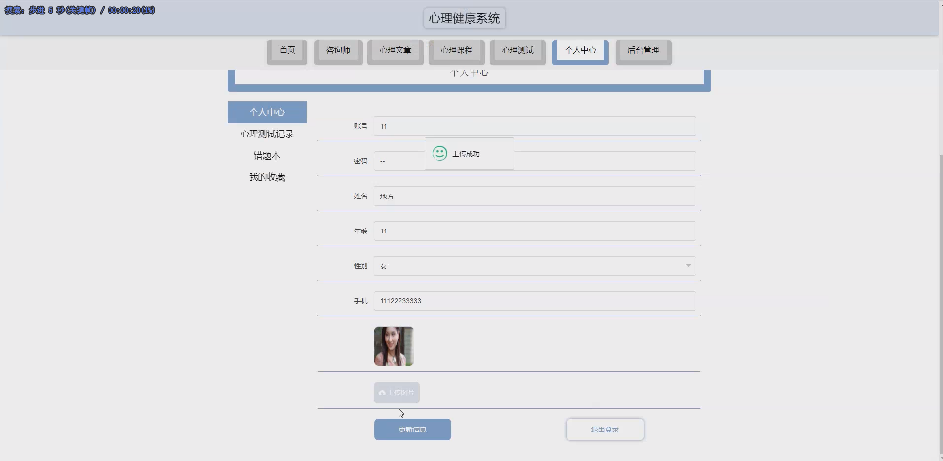 心理档案模块:为每位用户建立专属心理档案,记录基本信息、咨询记录、心理测评结果、课程学习进度等内容;咨询师可实时更新档案,用户可查看个人档案(脱敏处理敏感信息)。