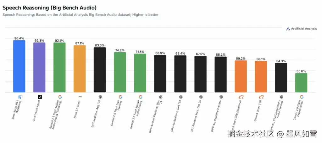 在全球权威的 Artificial Analysis Speech Reasoning 评测中,Step-Audio-R1.1 拿下了 96.4% 的准确率。这个数字意味着什么?意味着它直接登顶榜首,把大名鼎鼎的 Grok、Google 的 Gemini,甚至是 OpenAI 的 GPT-Realtime 都甩在了身后。