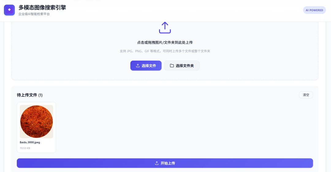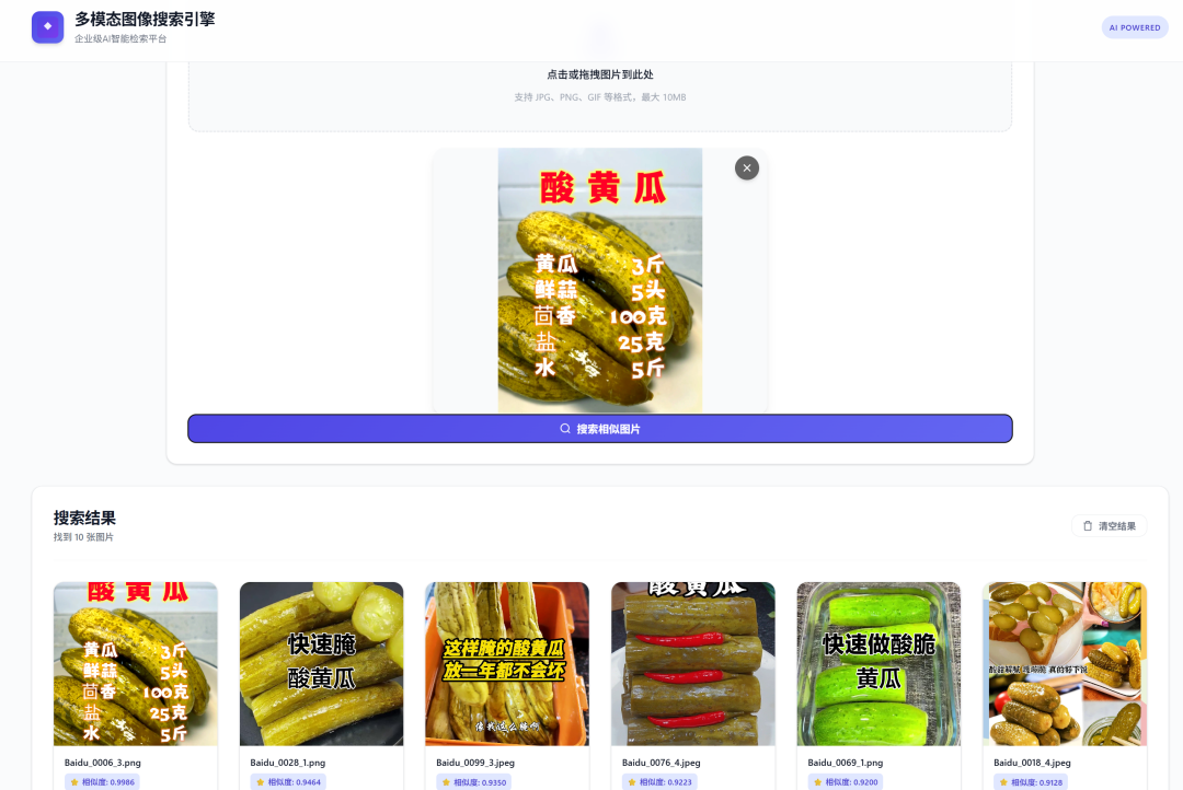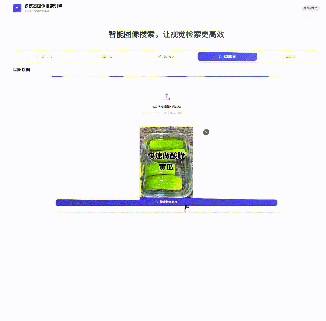 使用原生 HTML/CSS/JavaScript 构建现代化界面,包含上传界面、搜索界面和结果展示三大模块,支持文件拖拽上传、实时预览和交互式搜索体验。