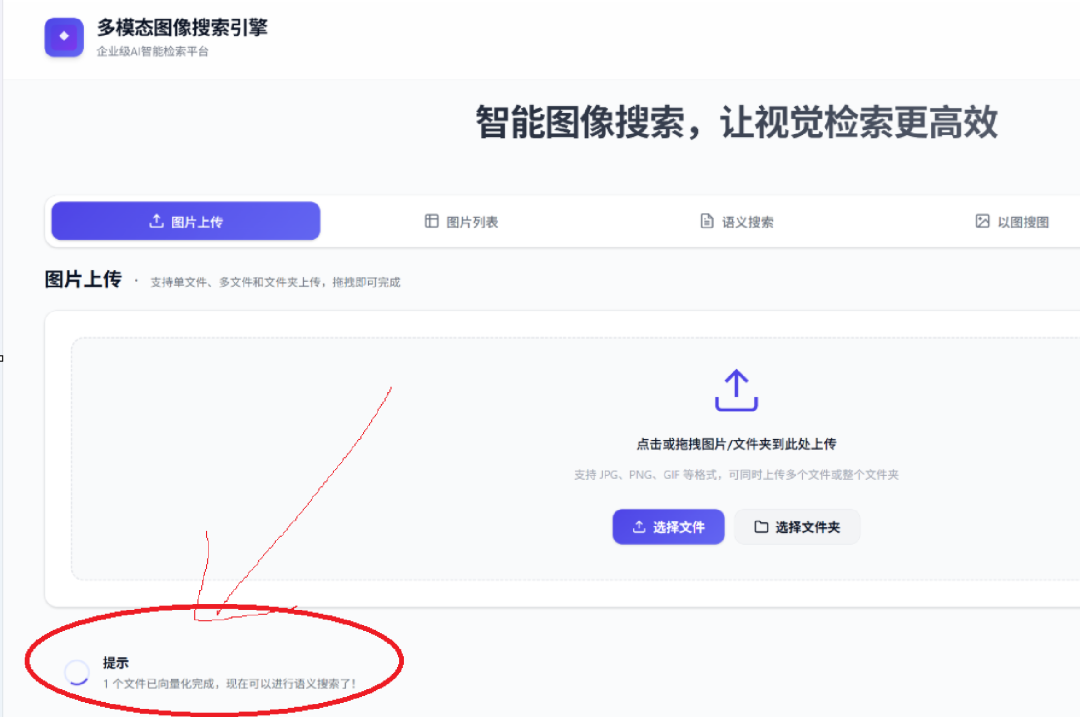 上传过程提供实时进度反馈,向量化完成后自动提示用户可以进行搜索,极大提升了用户体验。