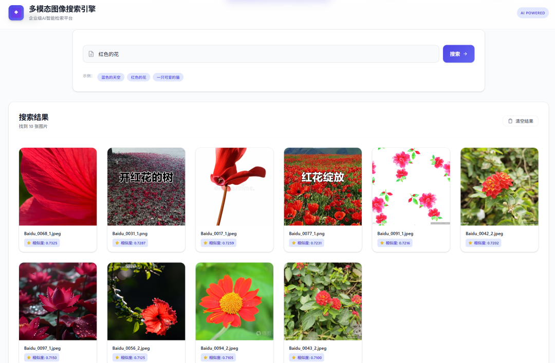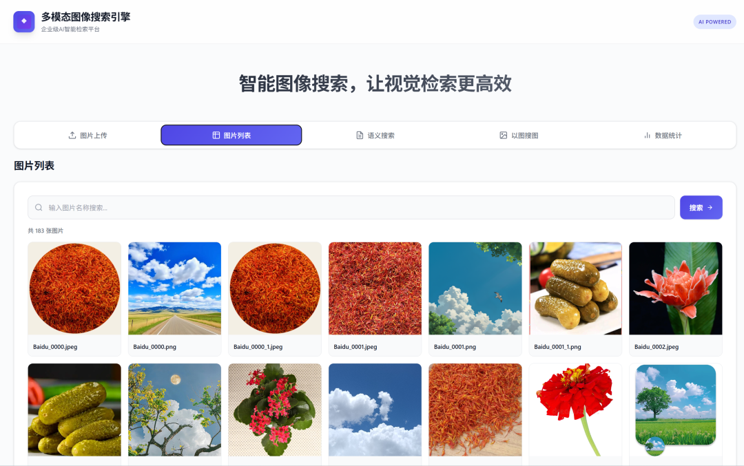 该图像搜索引擎系统为多模态语义搜索提供了完整的解决方案,适用于图像素材库管理、商品图像检索、内容推荐等多种业务场景,展现了深度学习技术与实际应用场景的有机结合。