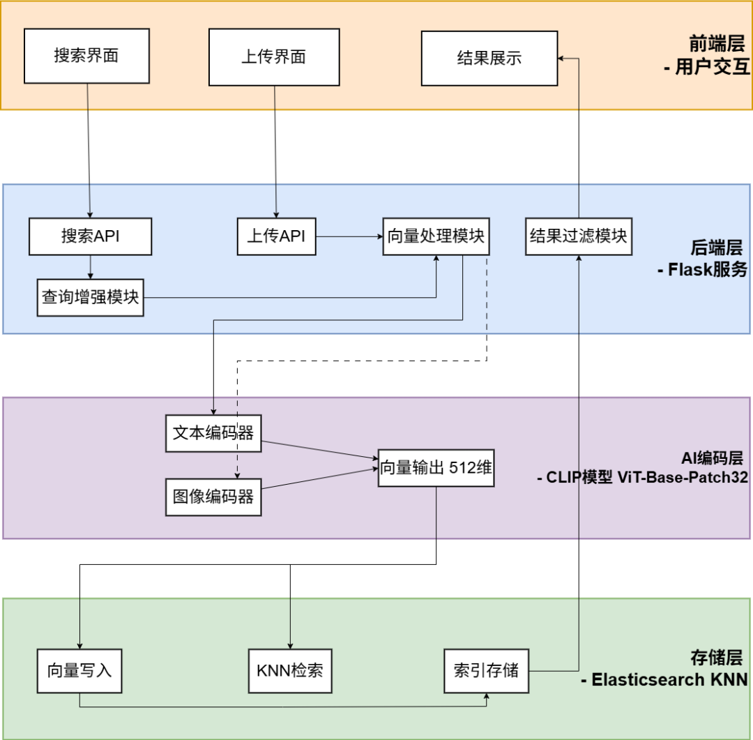 系统采用 Python Flask 作为后端框架,Easysearch 作为向量数据库,CLIP 模型作为多模态编码器,实现了从图像上传、向量化、索引存储到语义搜索的完整业务流程。