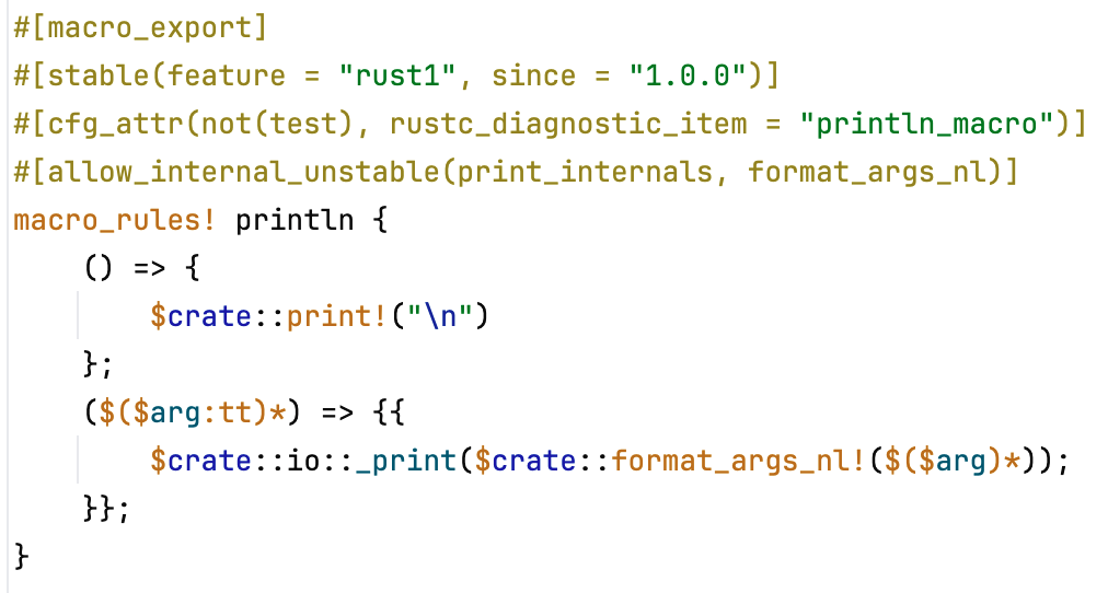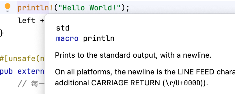 简单来说,宏就是"代码的魔术师",类似于Kotlin inline:你写下一行宏代码,它在程序编译之前,会根据你定义的规则自动"膨胀"成一大堆复杂的代码。想象你定义了一个叫 say_hello! 的宏。当你写 say_hello!() 时,宏会在编译前自动把它替换成 println!("Hello World")代码,而不是函数调用。