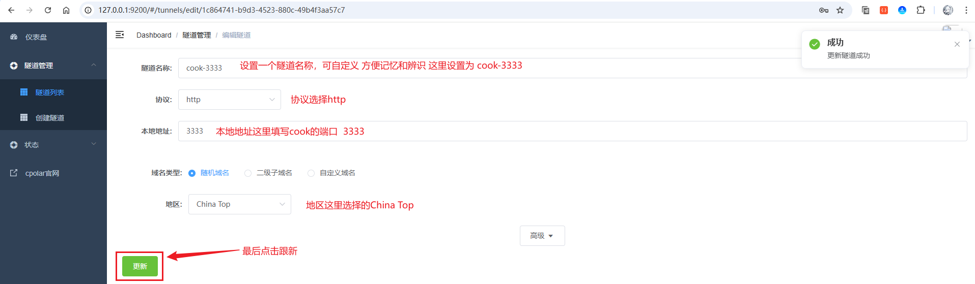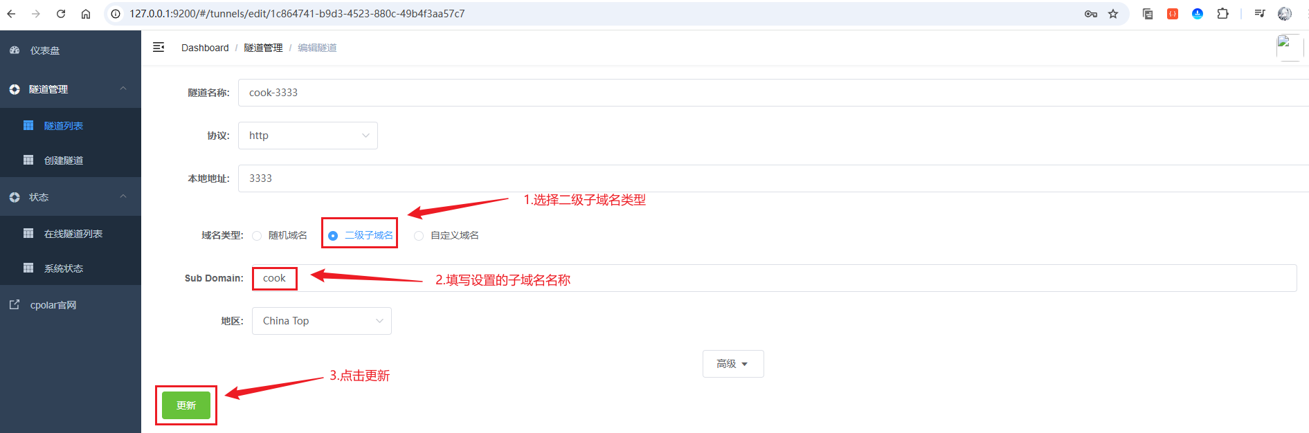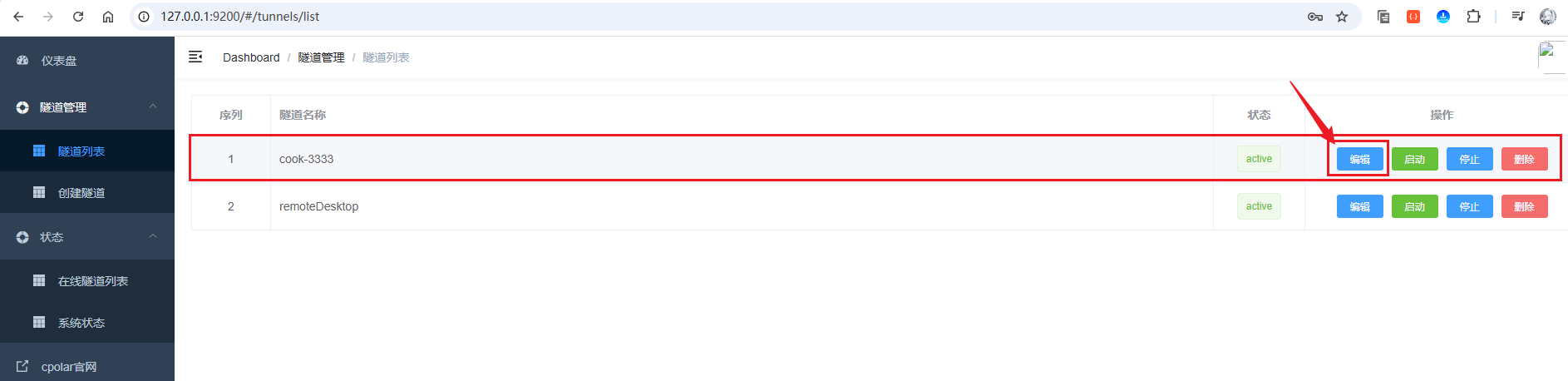 接着,进入侧边菜单栏的隧道管理下的隧道列表,可以看到名为cook-3333的隧道,点击编辑按钮进入编辑页面: