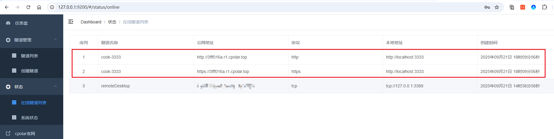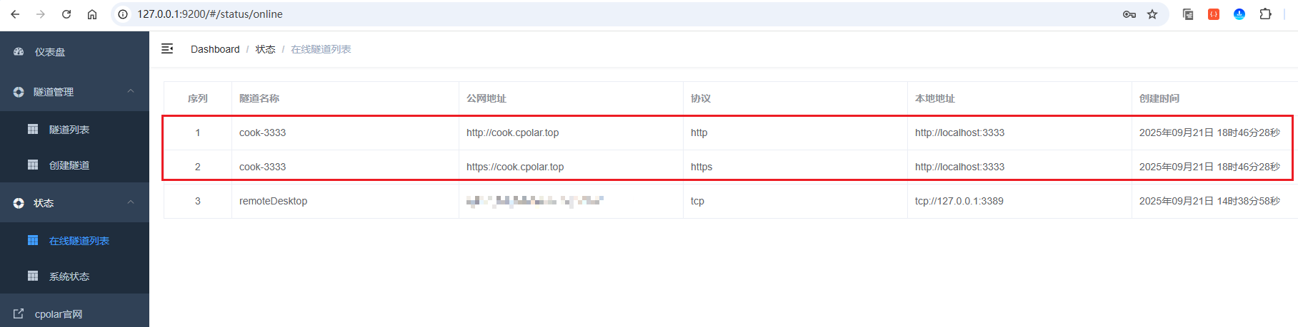 接着来到在线隧道列表,可以看到名称为cook-3333隧道的两条记录信息,一条协议为http,另一条协议为https: