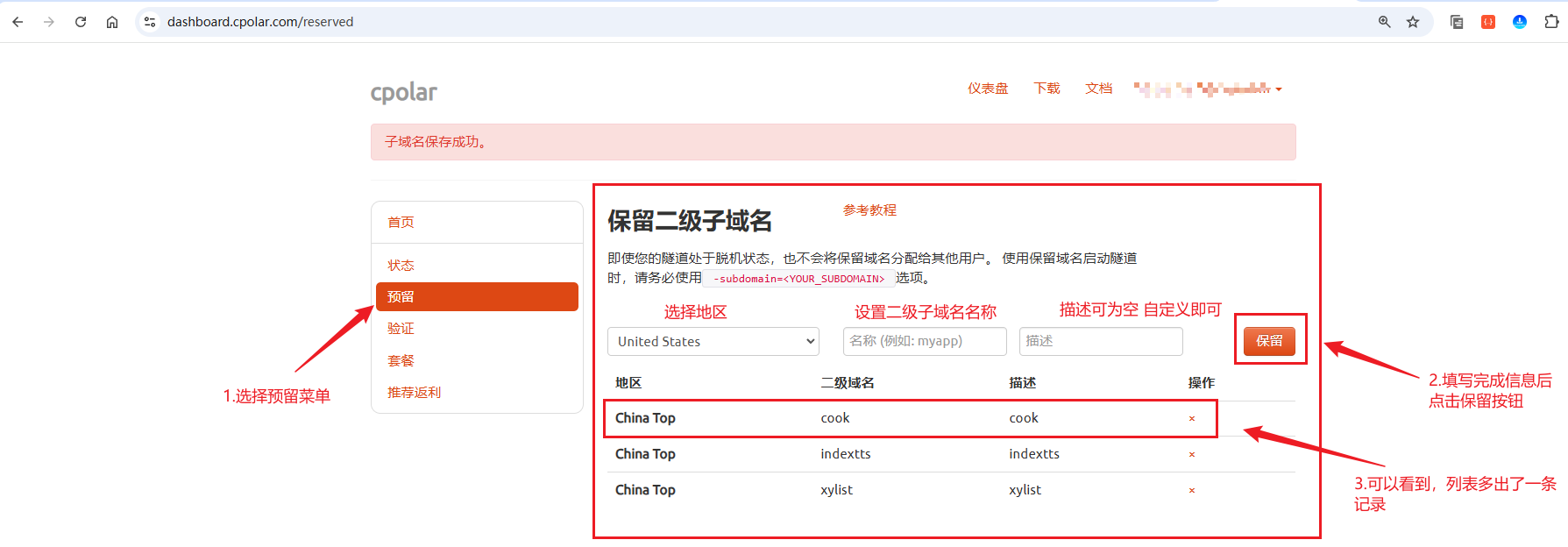 选择预留菜单,即可看到保留二级子域名项,填写其中的地区、名称、描述(可不填)项,然后点击保留按钮,操作步骤图如下: