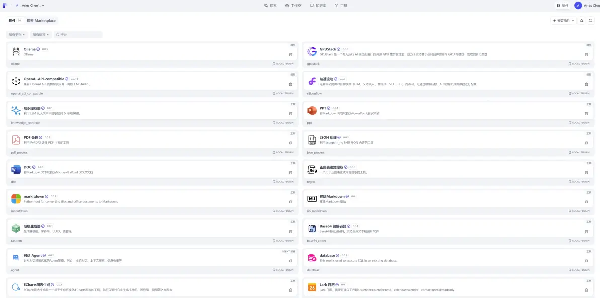常用插件:OpenAI-API-compatible、Ollama、rookie_text2data、ECharts图表生成、MinerU文档解析、文档转换、OCR解析、MCP服务 等工具插件。