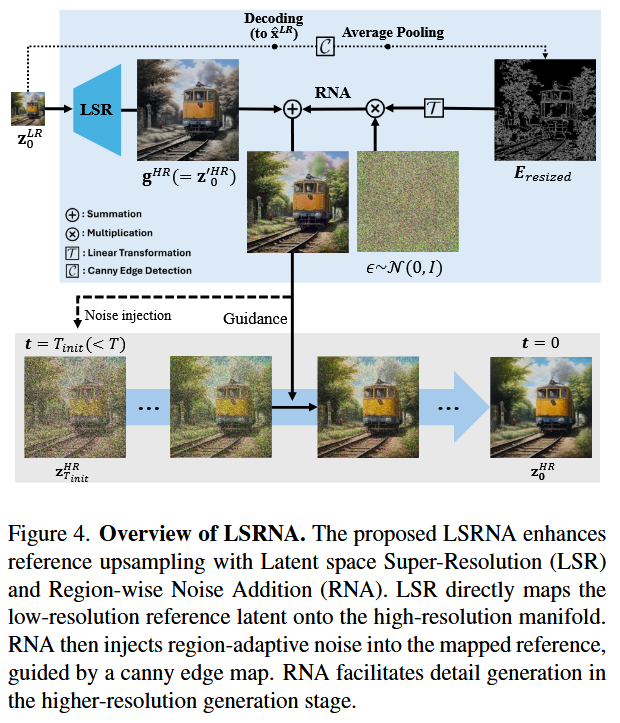 建议参考论文中的 Figure 4,该图清晰展示了 LSR 如何对 Latent 进行超分,以及 RNA 如何通过 Edge Map(边缘图)来控制噪声注入的位置。