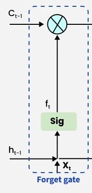 The information that is no longer useful in the cell state is removed with the forget gate. Two inputs x t x_t xt (input at the particular time) and h t − 1 h_{t-1} ht−1 (previous cell output) are fed to the gate and multiplied with weight matrices followed by the addition of bias. The resultant is passed through sigmoid activation function which gives output in range of [0,1]. If for a particular cell state the output is 0 or near to 0, the piece of information is forgotten and for output of 1 or near to 1, the information is retained for future use.