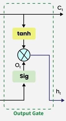 The output gate is responsible for deciding what part of the current cell state should be sent as the hidden state (output) for this time step.First, the gate uses a sigmoid function to determine which information from the current cell state will be output. This is done using the previous hidden state h t − 1 h_{t - 1} ht−1 and the current input x t x_t xt: