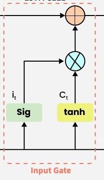 The addition of useful information to the cell state is done by the input gate. First the information is regulated using the sigmoid function and filter the values to be remembered similar to the forget gate using inputs h t − 1 h_{t-1} ht−1 and x t x_t xt. Then, a vector is created using tanh function that gives an output from -1 to +1 which contains all the possible values from h t − 1 h_{t-1} ht−1 and x t x_t xt. At last the values of the vector and the regulated values are multiplied to obtain the useful information. The equation for the input gate is: