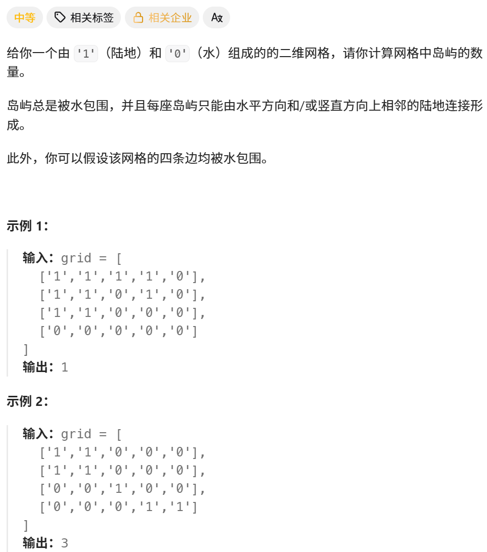 - 广度/深度优先搜索。广度优先:起始节点入队列,如果水平、垂直方向相邻位置为1切没被访问过(被访问过的1位置,直接改为0),就进队列,重复上述过程,直到队列为空。计数1个岛屿数。
