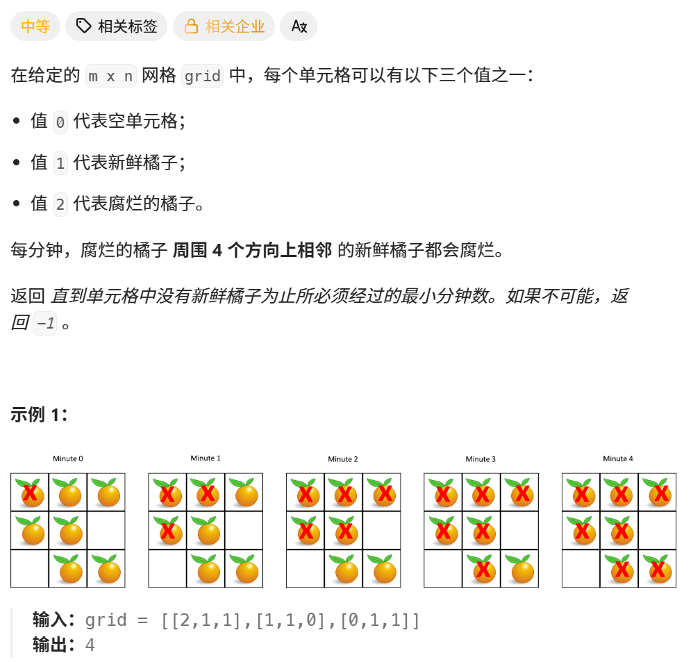 // 找到初始状态中所有的腐烂橘子,放入队列,作为起始点开始搜索