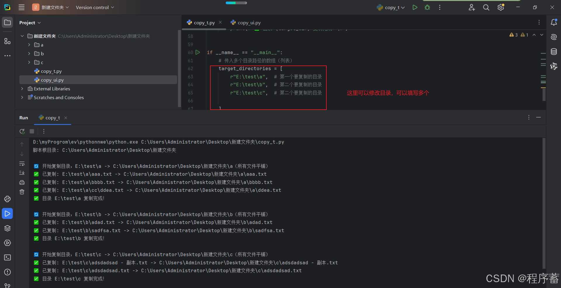 pythonimport os import shutil def copy_files_to_root(target_dirs): """ 将多个指定目录下的所有文件(包括子目录)复制到当前脚本的根目录, 所有文件平铺到以源目录名命名的文件夹中(无嵌套子目录) Args: target_dirs (list): 要复制的源目录路径列表 """ # 获取当前脚本的根目录(即运行该py文件的目录) script_root = os.path.dirname(os.path.abspath(__file__)) print(f"脚本根目录: {script_root}\n") # 遍历每个目标目录 for target_dir in target_dirs: # 检查源目录是否存在 if not os.path.isdir(target_dir): print(f"⚠️ 错误:源目录 {target_dir} 不存在,跳过该目录!") continue # 获取源目录的名称(作为根目录下的目标文件夹名) dir_name = os.path.basename(os.path.normpath(target_dir)) # 最终目标文件夹(脚本根目录 + 源目录名) dest_root = os.path.join(script_root, dir_name) # 创建目标文件夹(不存在则创建) os.makedirs(dest_root, exist_ok=True) print(f"🔄 开始复制目录:{target_dir} -> {dest_root}(所有文件平铺)") # 遍历源目录下的所有文件(包括子目录) for root, dirs, files in os.walk(target_dir): # 复制当前目录下的所有文件(直接放到目标根文件夹) for file in files: # 源文件完整路径 src_file = os.path.join(root, file) # 初始目标文件路径(平铺到目标根文件夹) dest_file = os.path.join(dest_root, file) # 处理重名文件:如果文件已存在,自动添加序号(如 file.txt -> file_1.txt) counter = 1 while os.path.exists(dest_file): file_name, file_ext = os.path.splitext(file) dest_file = os.path.join(dest_root, f"{file_name}_{counter}{file_ext}") counter += 1 # 复制文件 try: shutil.copy2(src_file, dest_file) print(f"✅ 已复制: {src_file} -> {dest_file}") except Exception as e: print(f"❌ 复制失败: {src_file} 原因: {e}") print(f"✅ 目录 {target_dir} 复制完成!\n") if __name__ == "__main__": # 传入多个目录路径的数组(列表) target_directories = [ r"E:\test\a", # 第一个要复制的目录 r"E:\test\b", # 第二个要复制的目录 r"E:\test\c", # 第二个要复制的目录 ] # 执行复制操作 copy_files_to_root(target_directories) print("📚 所有指定目录的文件复制完成!")