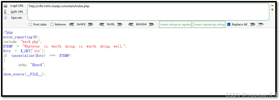 如下所示,这是一个典型的反序列化的简单密钥获取关卡,由于 TEMP 是一个普通字符串,我们需要将 TEMP 序列化后的字符串通过 str 参数传递,这样 unserialize(_GET['str']) 就会返回 "Whatever is worth doing is worth doing well.",从而满足条件,打印出 key4。详细注释后源码如下所示。