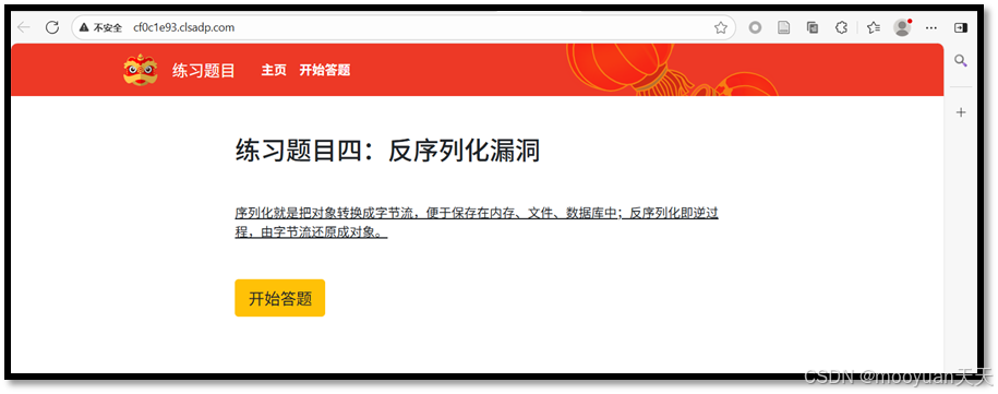 打开靶场,页面提示"++序列化就是把对象转换成字节流,便于保存在内存、文件、数据库中;反序列化即逆过程,由字节流还原成对象。++",如下所示。