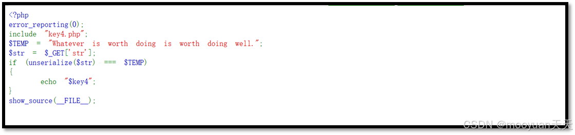| <?php // 关闭所有错误报告,避免执行过程中显示敏感错误信息 error_reporting(0); // 引入外部文件key4.php,该文件中应包含key4变量,存储目标密钥 include "key4.php"; // 定义固定字符串变量TEMP,作为反序列化验证的基准值 TEMP = "Whatever is worth doing is worth doing well."; // 从GET请求参数'str'中获取用户输入的序列化字符串 str = _GET\['str'\]; // 反序列化处理:将字符串转换为PHP值,并与TEMP进行全等比较(类型和值都必须相同) if (unserialize(str) === TEMP) { // 如果验证通过,输出密钥key4的值 echo "key4"; } // 高亮显示当前文件的源代码(通常用于调试或教学展示) show_source(FILE); |