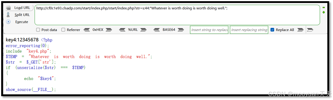 本次攻击的主要原理是构造正确的序列化字符串作为GET参数:?str=s:44:"Whatever is worth doing is worth doing well.";服务端接收参数后执行 unserialize($str),将序列化数据还原为原始字符串。还原后的字符串与预设的 $TEMP 变量进行全等比较 (===),因内容与长度完全匹配,条件成立。验证通过后,服务端输出 key4.php 中存储的密钥值 (echo $key4),从而直接获取目标 flag。