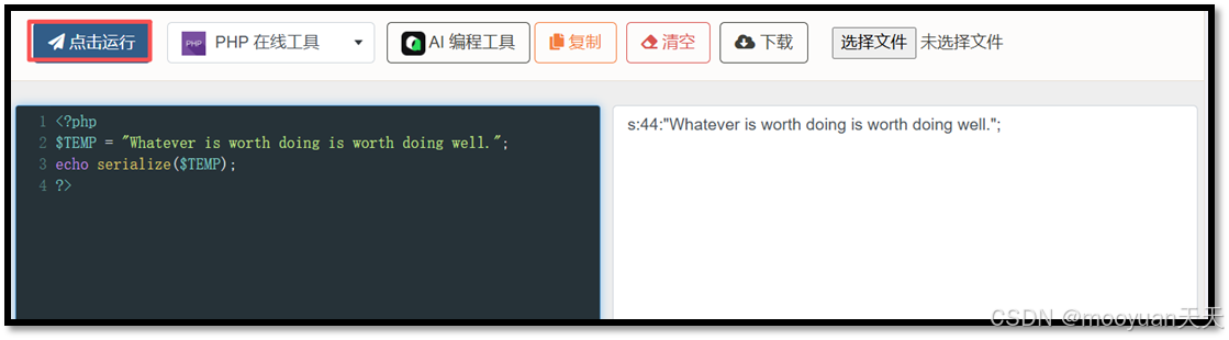 通过 GET 方式将序列化字符串作为 str 参数传递给服务端:?str=s:44:"Whatever is worth doing is worth doing well.";