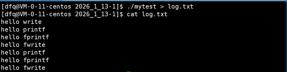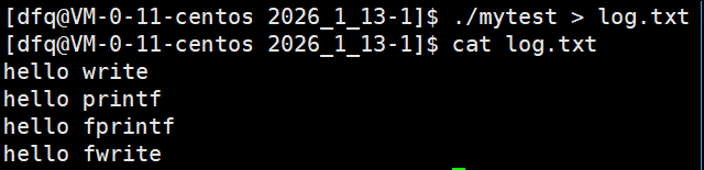 还是上述代码,当重定向至 log.txt 文件时,刷新策略变为了全缓冲,这显然是为了较少系统调用次数,提高效率,所以 write 调用最先写入 log.txt(无缓冲,立即写入文件),其余的按调用次序写入