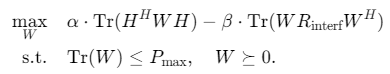 - 功率约束:Tr(W)≤PmaxTr(W)≤P_{max}Tr(W)≤Pmax;