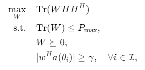 - 变量定义 :将波束成形向量 w∈CNw∈C^Nw∈CN转换为矩阵变量 W=wwHW=ww^HW=wwH,满足 W⪰0W⪰0W⪰0且秩为1。