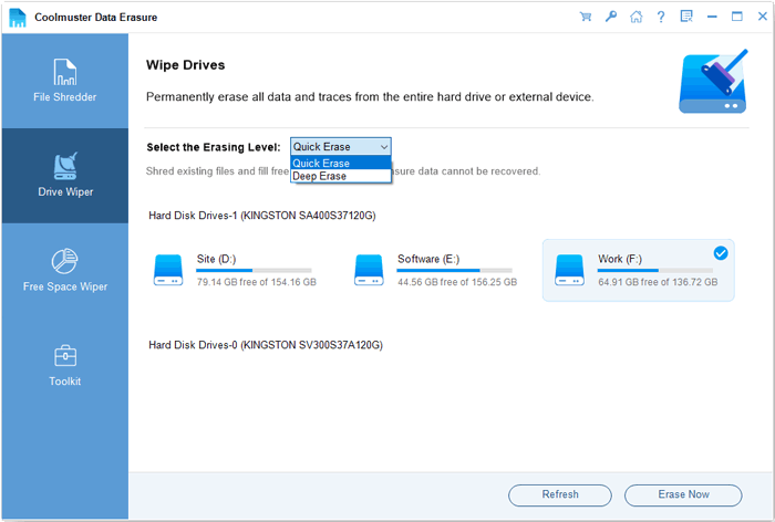 如果您想彻底且不可逆地删除 HP 笔记本电脑中的所有数据, Coolmuster Data Erasure是一款高度可靠的专业工具。支持DoD 5220.22-M、Gutmann算法等多种国际数据擦除标准,确保删除的数据无法通过任何数据恢复软件恢复。