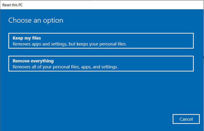 步骤 2. 您将看到两个选择:"保留我的文件"或"删除所有内容"。要完全删除所有数据,请选择"删除所有内容"。这将从您的笔记本电脑中删除所有个人文件、应用程序和设置。