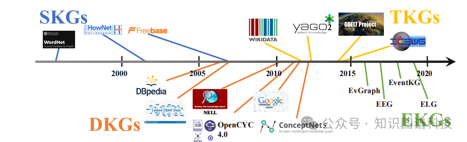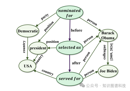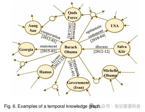 时序知识图谱在三元组中附加时间信息,形成四元组(主语实体, 关系, 宾语实体, 时间戳)的表示形式。这使得知识图谱能够明确表达事实的有效时间范围或发生时刻。主要的时序知识图谱包括: