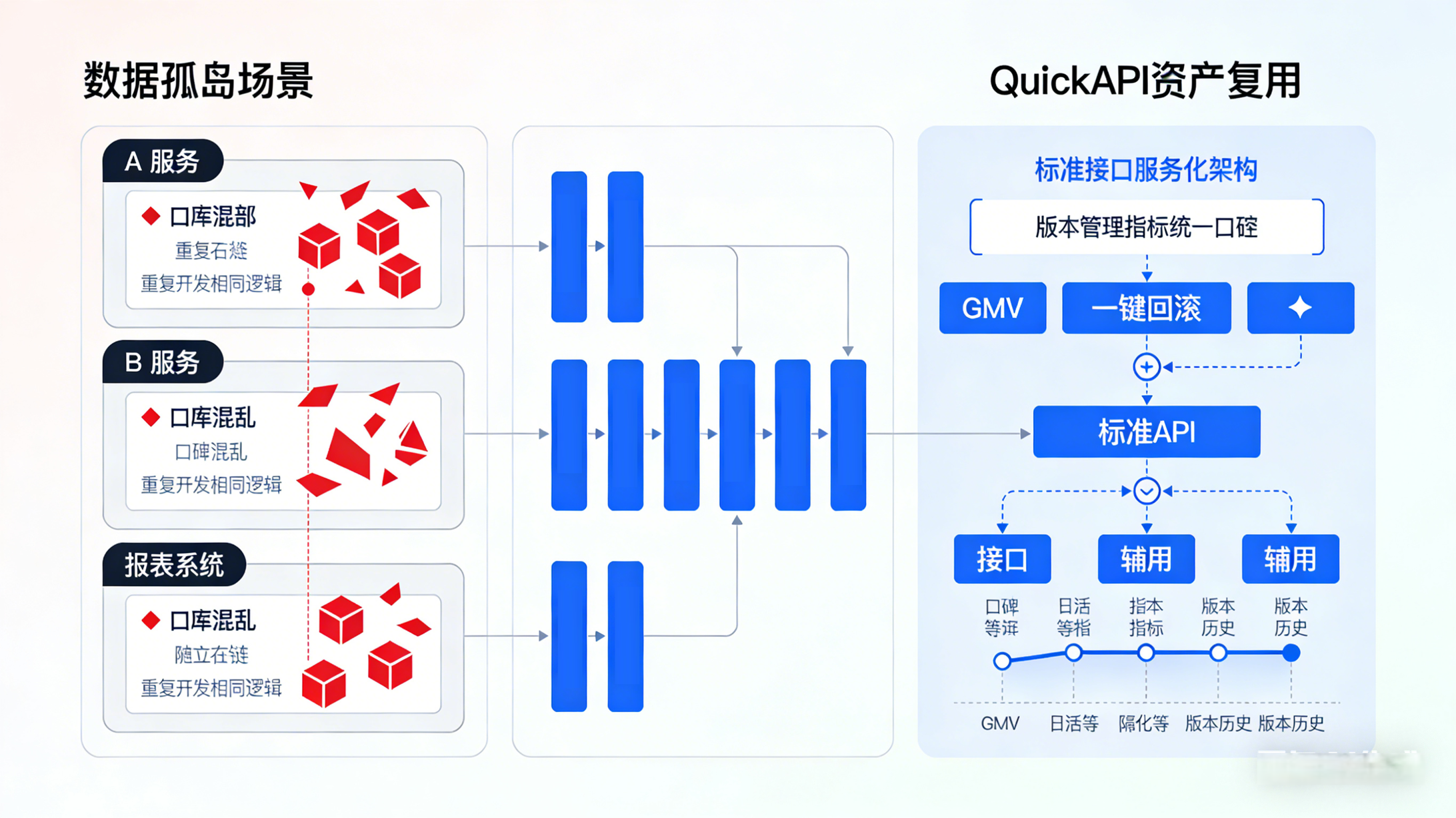 逻辑复用与口径统一: 团队可以将核心的业务报表逻辑固化为 QuickAPI 中的标准接口。各个微服务或前端应用不再重复编写查询逻辑,而是统一调用该 API。这确保了全公司在使用"GMV"、"日活"等关键指标时,遵循的是唯一的、标准的数据口径。