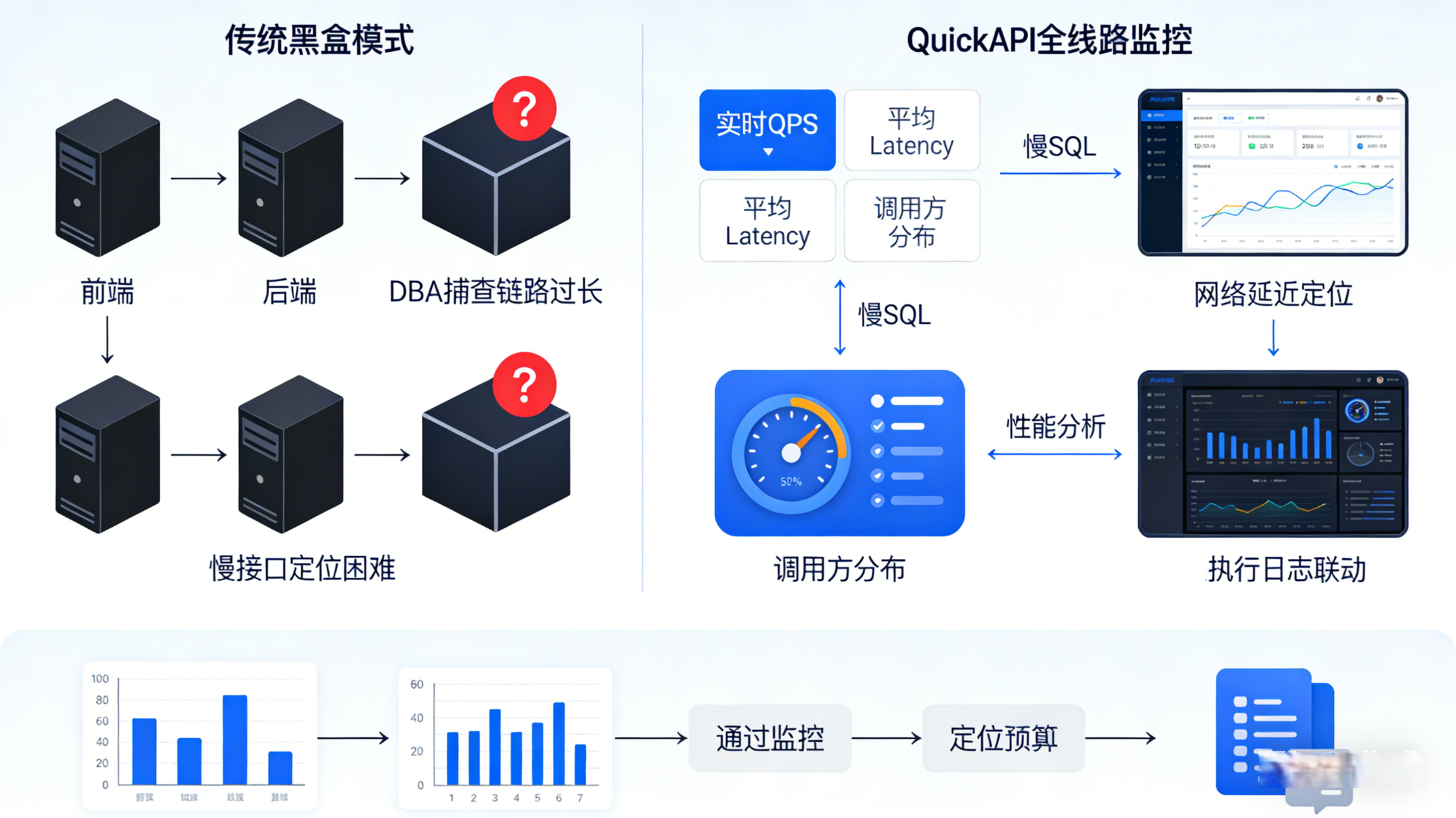 当 API 响应变慢时,传统排查链路非常痛苦:前端找后端,后端查日志,DBA 抓包。QuickAPI 提供了全链路的 API 可观测性。