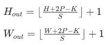 - 规则:若输入尺寸为 H×W,卷积核尺寸为 K×K,步长 S,填充 P,则输出尺寸为: