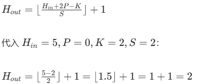 同理 Wout=2,最终池化输出为 2×2 矩阵(输入边缘不足 2×2 的区域会被舍弃)。