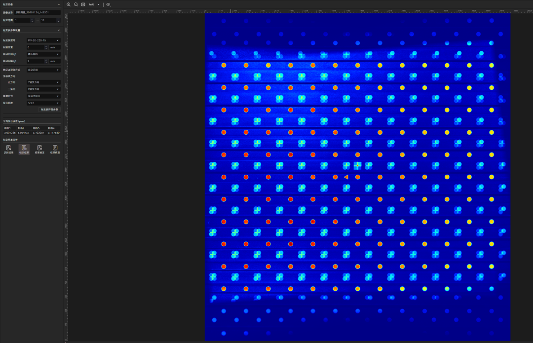 第五步 采集标定图像,随后采用映射方式为多项式拟合的标定方法进行第一次标定,平均拟合误差仅3个像素(全像素数量2100万),标定结果优秀。
