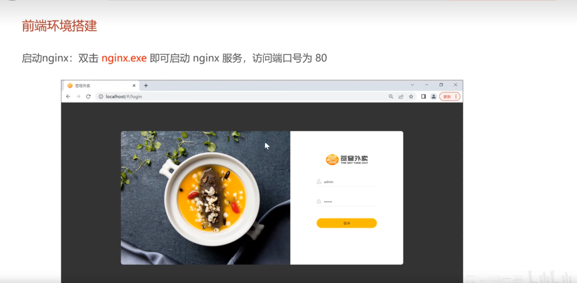 打开浏览器页面,地址栏输入localhost,默认访问80端口,即可访问到nginx中的前端工程页面
