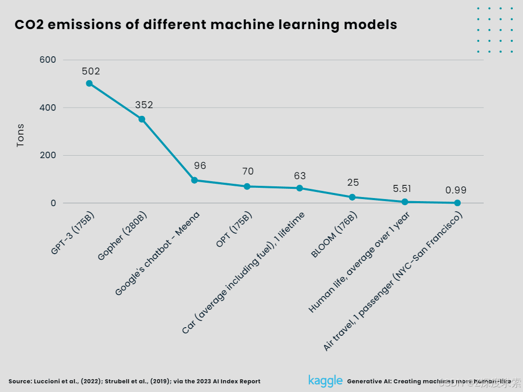 Given their enormous environmental effect, generative AI models---in particular LLMs like GPT-3---have raised serious concerns. Stanford University's AI Index Report 2023 states that in 2022, GPT-3 produced 500 times as much carbon dioxide as a round-trip flight between New York and San Francisco. Similar emissions from other AI models, such as ChatGPT, are also mentioned in the paper. The International Energy Agency estimates that approximately 1% of the world's electrical consumption and greenhouse gas emissions are attributed to data centers, while the global IT industry is responsible for 1.8% to 3.9% of all emissions.