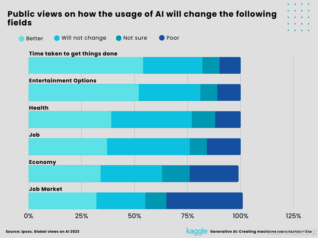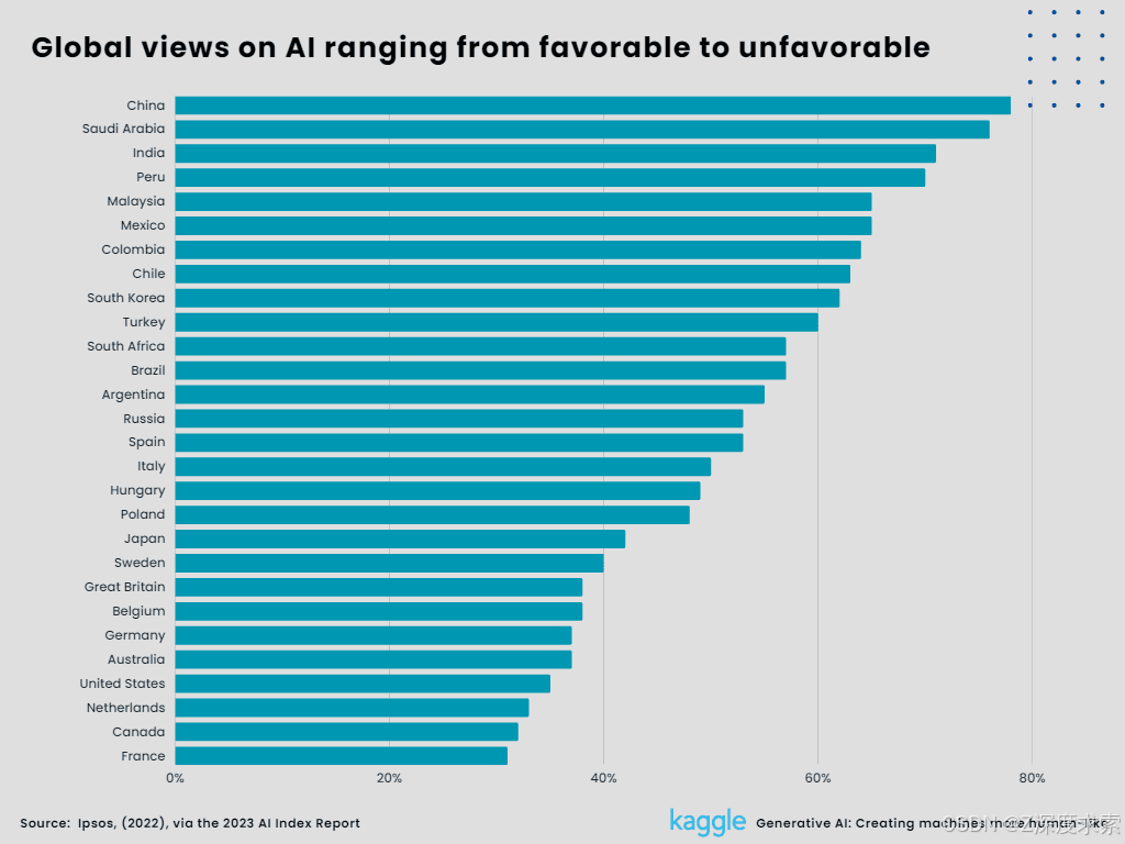 In a study done by the international research organization IPSOS, 78% of Chinese participants said that there are more advantages to employing artificial intelligence than disadvantages. Only 35% of Americans believe AI has a net advantage, with France having the lowest perception at 31%. According to IPSOS, males are generally more supportive of AI than women. China, Saudi Arabia, India, Peru, and Malaysia are the top five nations with favorable reviews. However, France, Canada, the Netherlands, the United States, and Australia are the top five nations with unfavorable reviews.