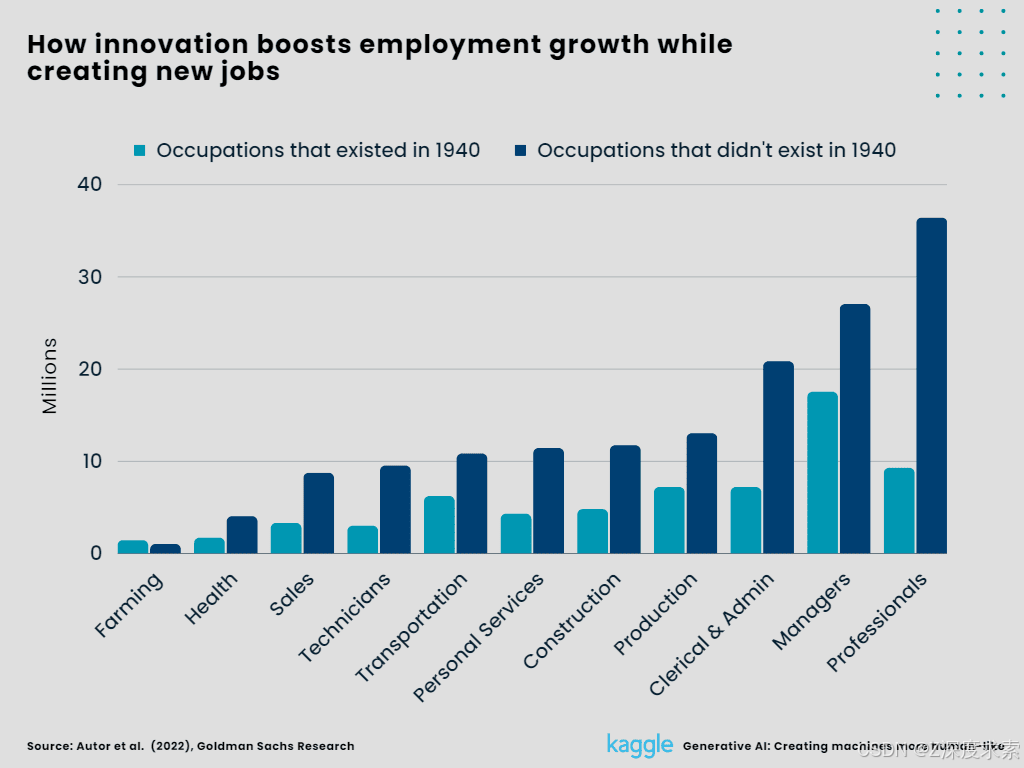 Almost, 60% of today's workforce operates in professions that weren't around in 1940. This suggests that the development of new jobs driven by technology accounts for more than 85% of the increase in employment over the past 80 years.