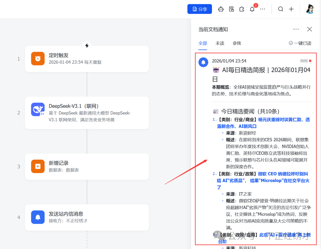 (1)当工作流定时触发后,可以接收到一个文档通知消息,里面就是我们的日报内容;
